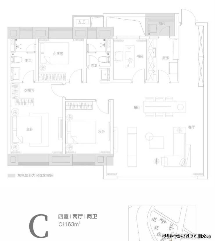 C户型建面约163-165平户型,四室两厅两卫,该户型三开间朝南,大横厅设计,非常气派,活动空间阔绰;户型南北通透,动静分区,主卧为套房设计,居住舒适度高,全房可优化面积也很多。