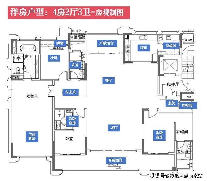 三个南向套房+一个北向次卧;主卧自带独立衣帽间+双台盆浴缸主卫;每个卧室都保证3.2米以上开间。
