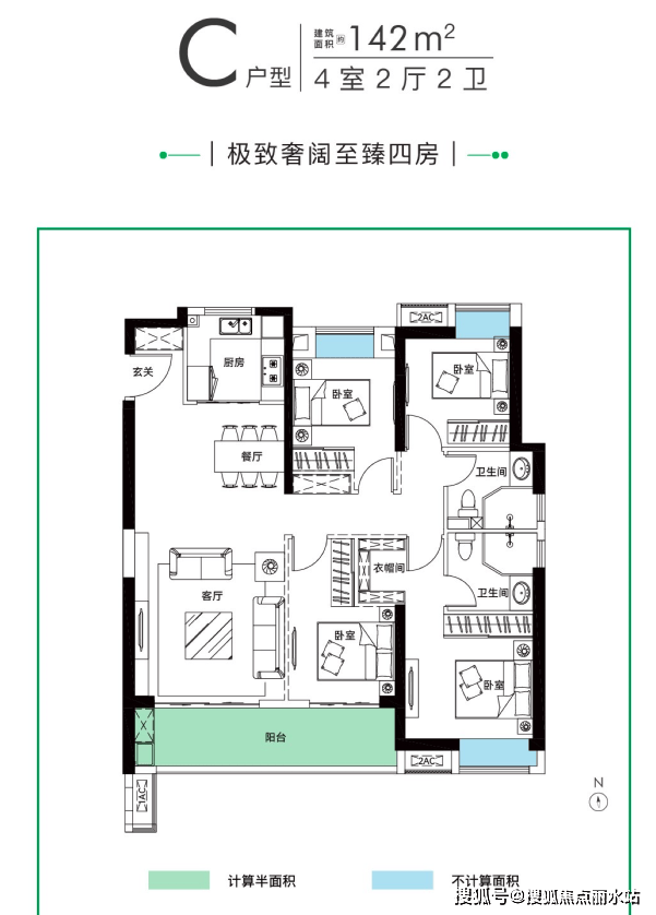 142㎡四房两厅两卫:四房东边户朝向设计,可以三向采光,对保持卫生间干燥通气性更佳,南向三开间朝南,动静分区,设置转角玄关私密性较强,南向面宽约10.6米,阳台开间约6.7米。