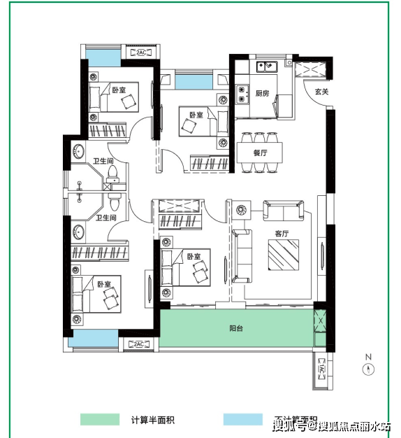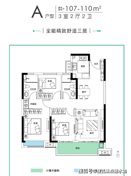 110㎡三房两厅两卫:常见方正户型设计,动静分区、三开间朝南,北向连廊,主卧套间设计约20㎡,阳台开间约5.3米。