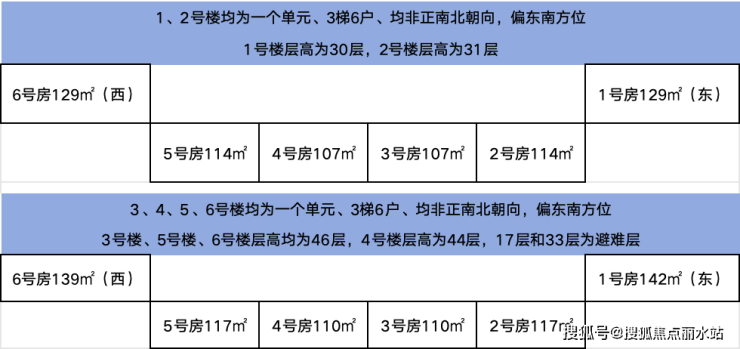 楼栋信息:规划6栋30-46层,107-142平米毛坯高层住宅,1#楼30层,2#楼31层,3#楼46层,4#楼44层,5#楼46层,6#楼46层。