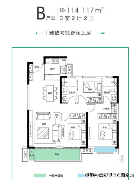 114㎡三房两厅两卫:和107户型(A户型)格局相同,尺寸有一定差异,布局朝向在右边(东);A户型南向开间约9.4米,B户型为9.9米;A户型阳台开间约5.3米,B户型阳台为5.6米;
