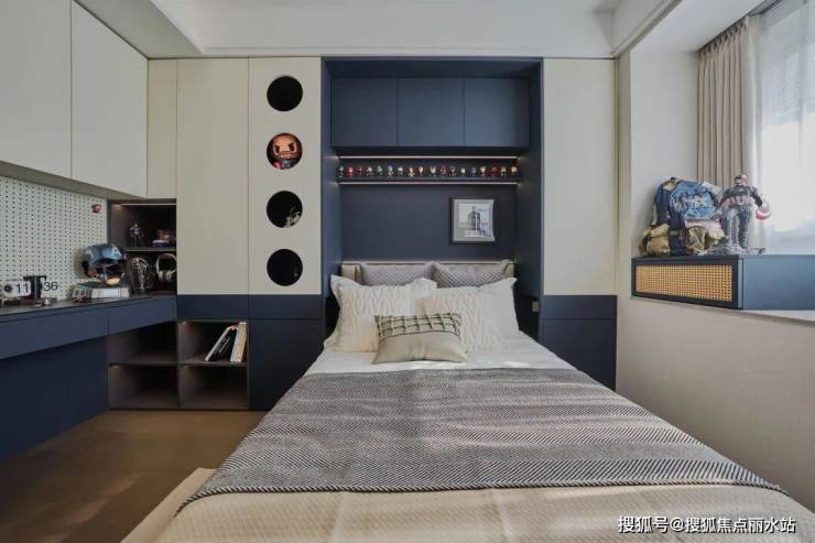 在这里,每一个空间都被设计成了孩子喜欢的样子,飘窗可以成为展柜,乐高、手办都可以放在这;L型的衣柜书柜一体化设计,将空间利用到了极致;就连床头也做了壁龛,可以摆放小孩子喜欢的物什