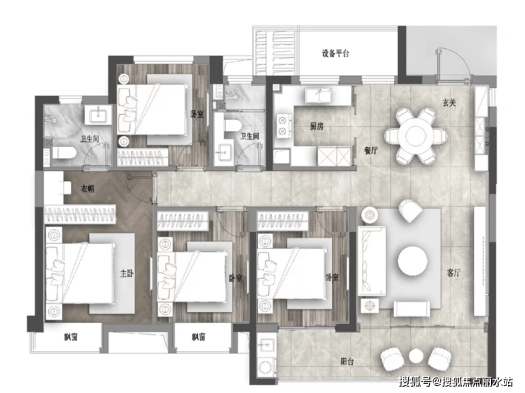 此外,它还拥有豪宅主卧的“尺度优势”,超21平米的套房主卧,步入式衣帽的西侧设计出独立化妆间的区域。让女主人可以在不被打扰的环境里,为新的一天化上精致的妆。