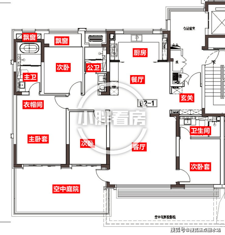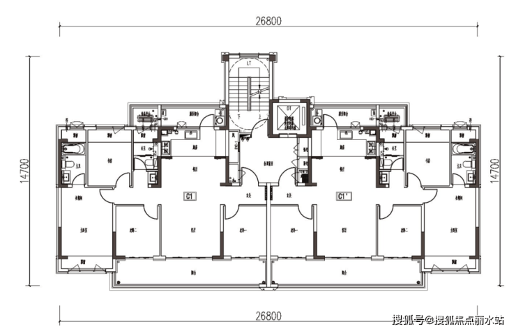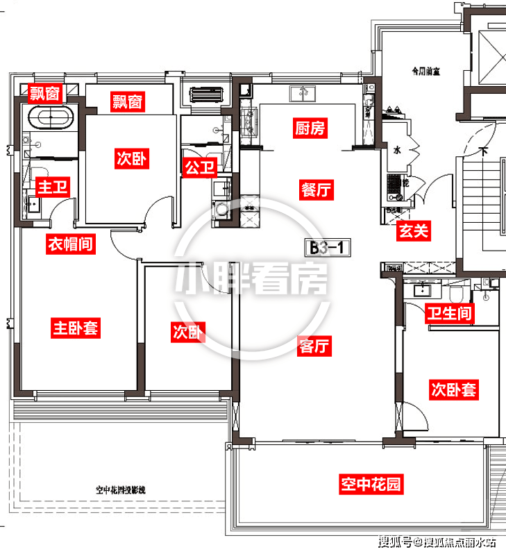 南向四开间,三卧室朝南,采光条件不错。主卧设计了独立内卫和衣帽间,270度采光设计(仅东西边户,中间两户为墙壁)。次卧也设计为套房,不过为暗卫。