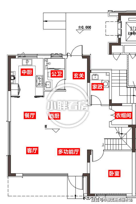 这是项目的下叠,南北双入户,一层主要是动区,中西双厨,南向大横厅。L型大厅,270度采光(仅东西户,中间户侧边为墙壁)。