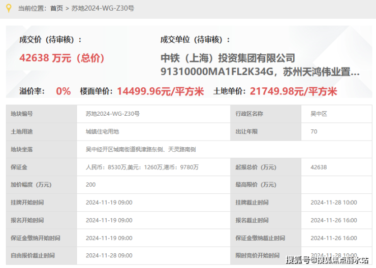中铁&天鸿伟业吴中城南30号地块项目,即,苏地2024-WG-Z30号地块项目,位于吴中经开区城南街道枫津路东侧、天灵路南侧,是2024年11月28日,中铁&天鸿伟业以底价42638万元竞得,成交楼面价14500元/平。