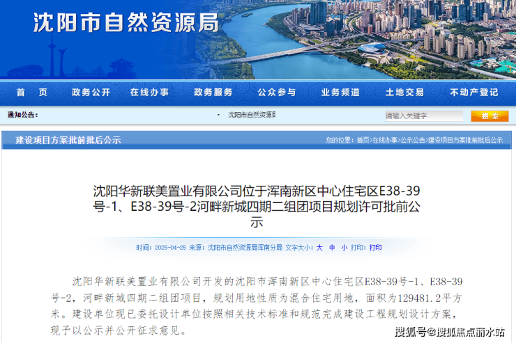 沈阳市自然资源局官网发布“沈阳华新联美置业有限公司位于浑南新区中心住宅区E38-39号-1、E38-39号-2河畔新城四期二组团项目规划许可批前公示”,奥体板块将上新!