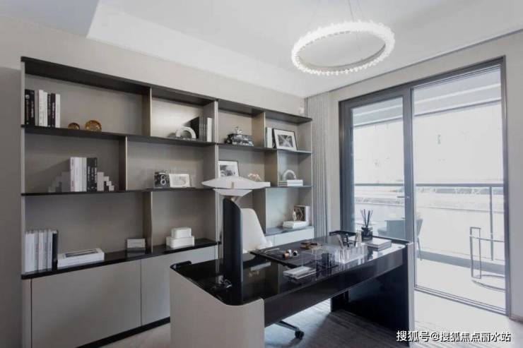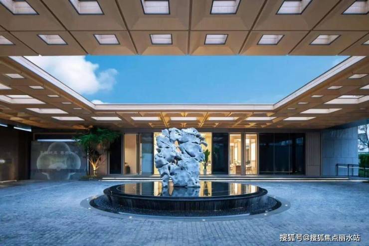 行至酒店式入户大堂,抬头可见顶部采用的中式博古架元素 ,以横竖线条相交形成错落有致、大小不等的花格纹样,极大提升了归家的仪式感和尊贵体验;环岛式落客设计让人仿佛置身豪华酒店,而极具昭示性的水景和点景雕塑 ,则悄然划定了这座纯粹墅境的领域界限。