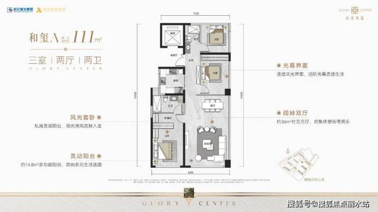 比如建面约111㎡户型,3面空间基本做到全开窗设计,最大一面连续采光面约15米。