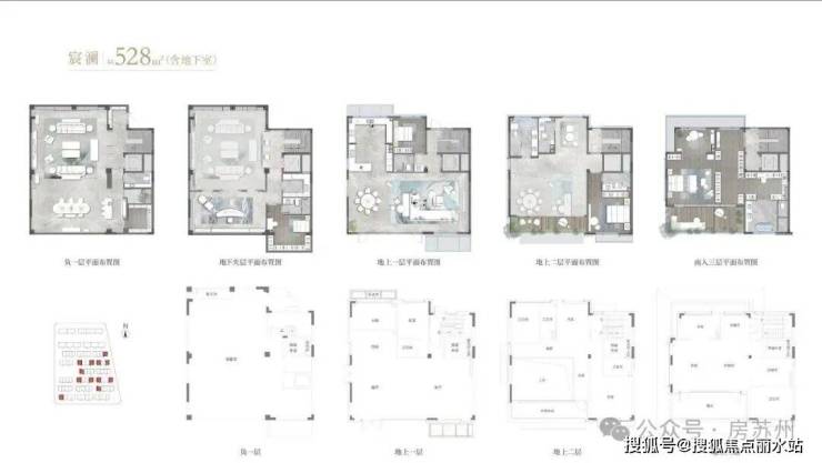 联排三款户型,建面约380㎡/470㎡/528㎡,均为地上三层设计,地下室地下挑高5.6米,可隔2层。