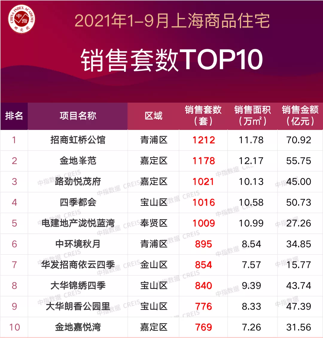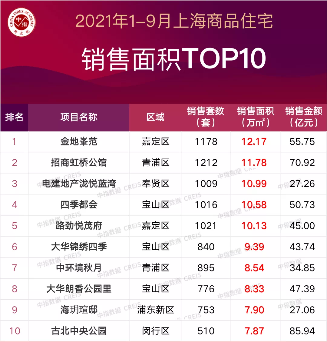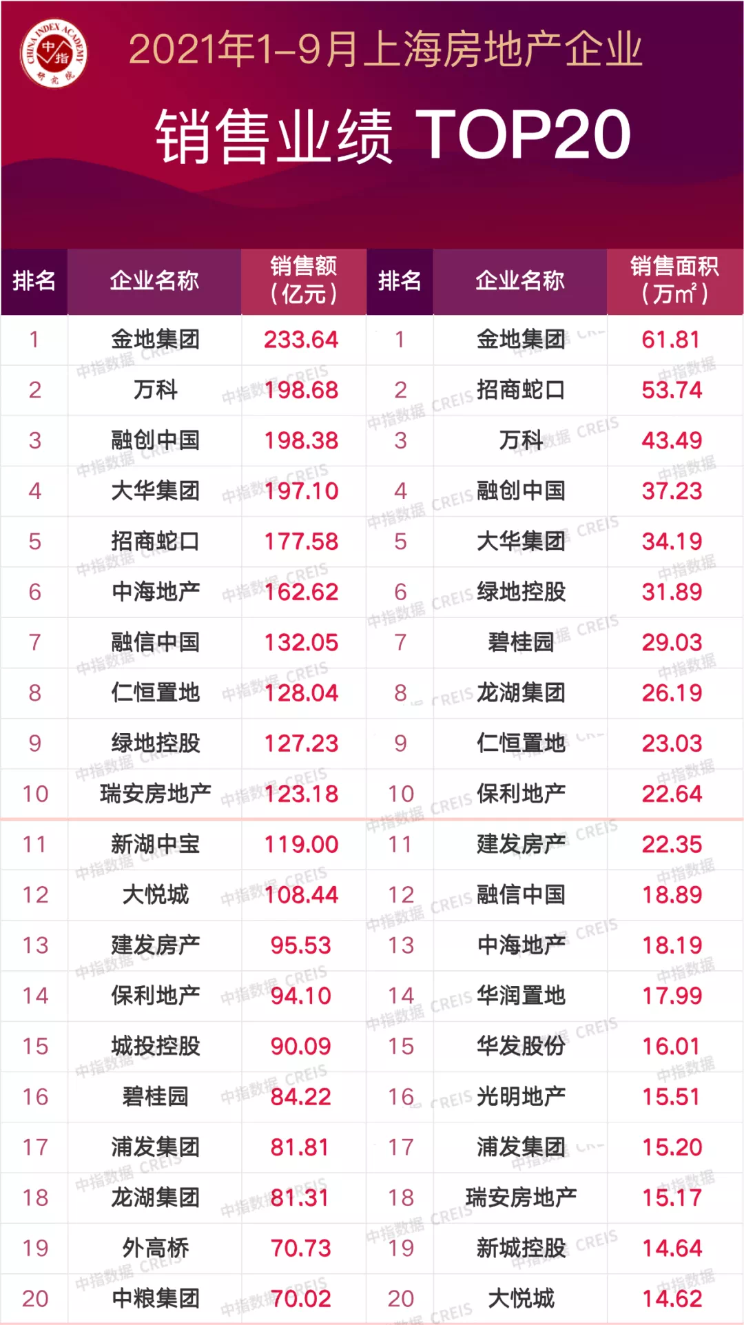 特别说明:房地产企业销售数据统计与项目销售数据统计均是以2021年1月1日-9月30日期间商品房合同销售额为统计口径,主要依据中指数据CREIS在上海的销售监测数据;本报告仅供参考,课题组不对使用报告及其内容所引发的任何直接或间接损失承担责任。