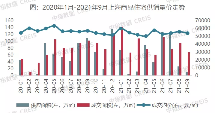 成交方面,2021年9月,上海市商品住宅(不含保障性住房)成交均价为54029元/㎡,环比下降3.37%,同比下降5.22%;成交面积为68.28万㎡,环比下降28.36%,同比下降33.10%。