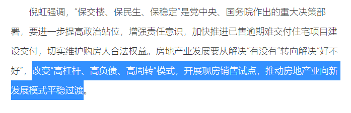 就在6月26日,住建部在与中国银行就深化政银合作、推动住房和城乡建设事业高质量发展交流会上强调,加快推进已售逾期难交付住宅项目建设交付……改变“高杠杆、高负债、高周转”模式,开展“现房销售“试点,推动房地产业向新发展模式平稳过渡。