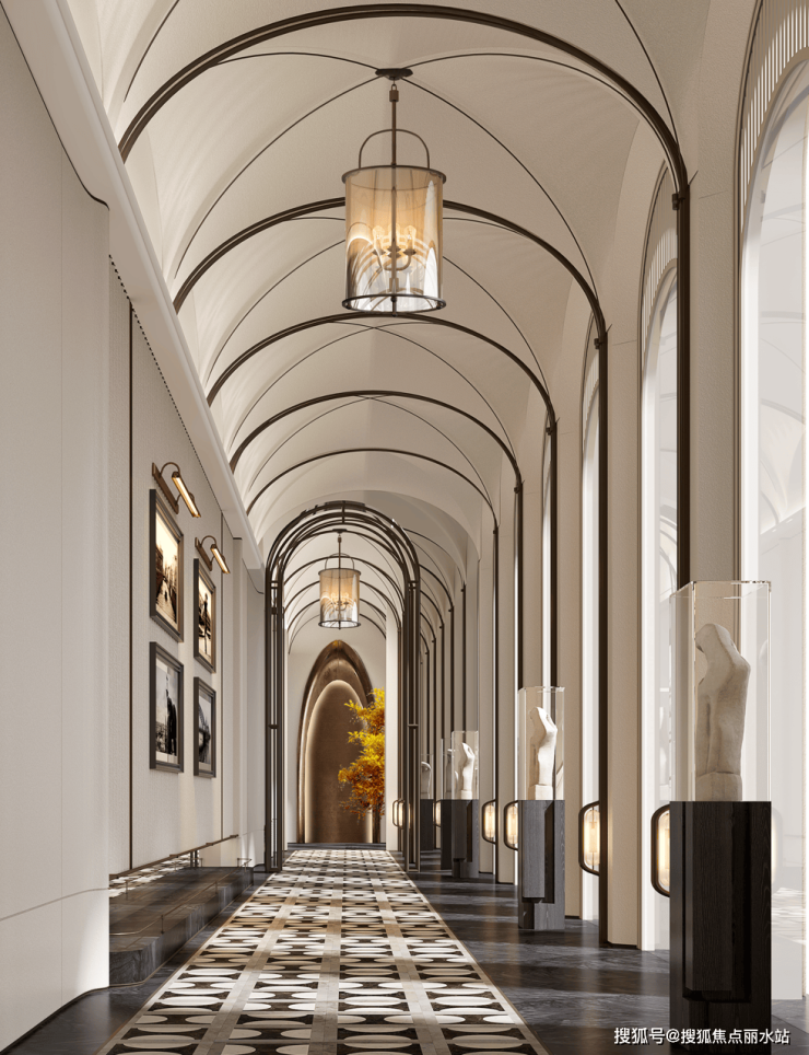 长达132米艺术长廊,高达7米,由41个拱门组成,甄选汤臣一品、深圳湾一号等超级豪宅同款的月光米黄天然石材,顶棚弧形造型均由整石异形切割工艺打造而成,每一帧皆是不吝成本、不惜损耗的高定风景。