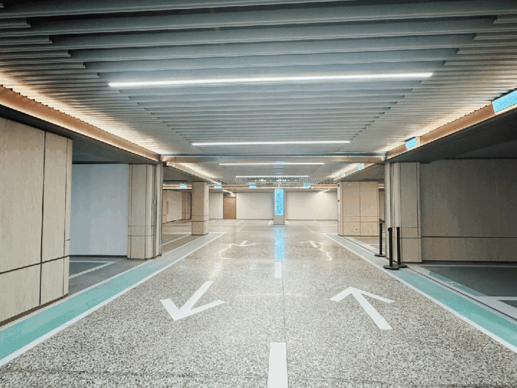 项目地库层高约3.9米,装修后也有2.6米高;地库景墙大部分采用玉石岩板、金属字和不锈钢线条。为了保证通风性,地库都安装了新风系统,成为其他房企学习的对象。