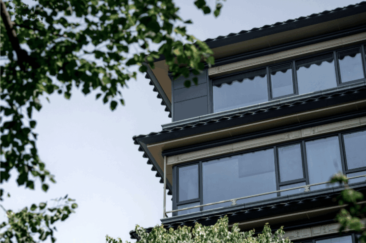 紫宸公馆的外立面,采用宋风规制,不仅融合转译了40多种古建元素,同时鼎甲置业还做了独创的鱼鳞瓦屋面披檐设计,层层有披檐,建筑层次感一下子提上来了。