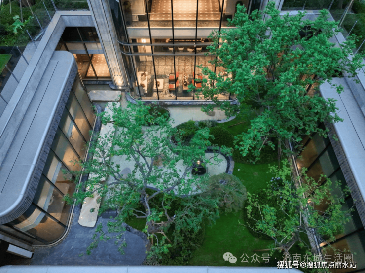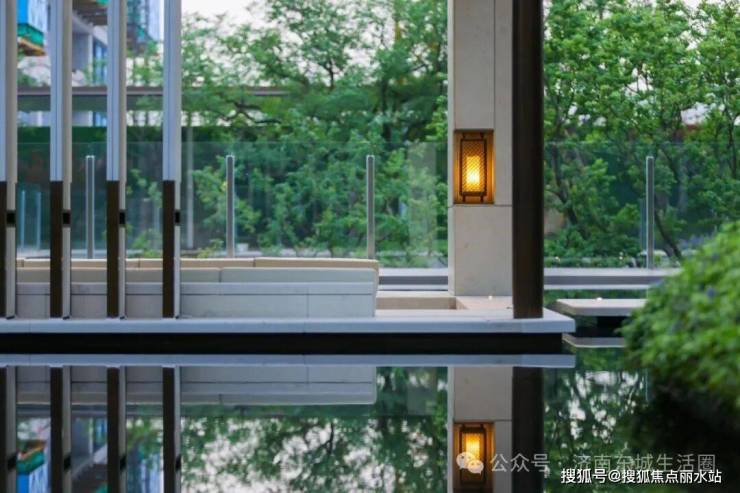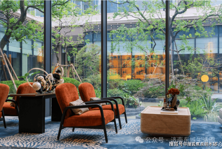 阔绰的川林水院,打破传统园林边界,构建了五重沉浸式景观序列:浮屿林地,绿岛错落隆起,野趣生境盎然;砚息客厅,休憩坐榻静候,树影婆娑中宜品茶观云;砚息回廊,勾连起移步换景的视觉动线;掬月水榭携无边镜池,倒映四季更迭;典藏乌桕虬枝探入水天,化作家家户户窗框里的鲜活艺术。