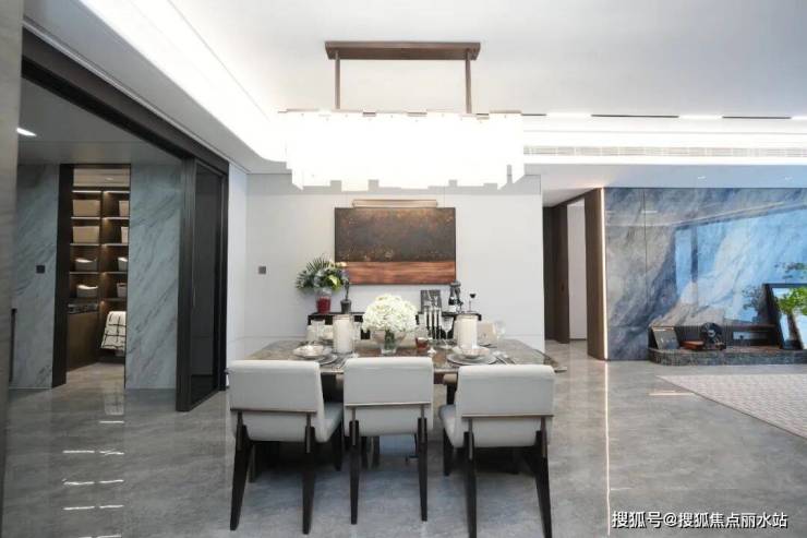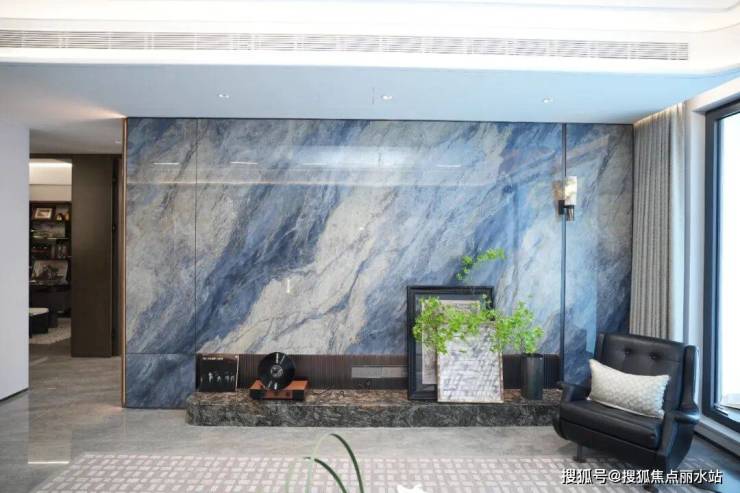 客厅背景墙采用阿帕奇蓝或瑞士湖蓝岩板,浅色系高档壁布通贴,餐客厅跌级吊顶+LED灯带,750mm×1500mm仿石地砖密缝拼接,枪灰色金属踢脚线……目光所及之处皆质感十足。