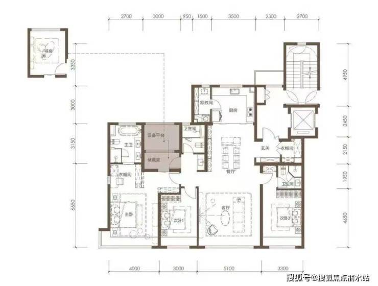 主卧采用商务套房设计,实现卧室、书房、卫生间互相连通。其中书房约9.6㎡,包含设备平台赠送面积约5.84 m²。