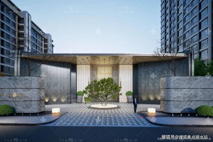 项目在社区外约50米处精心打造了迎君礼道,前方景墙运用奢华的海浪灰烧洗面花岗岩定制而成。
