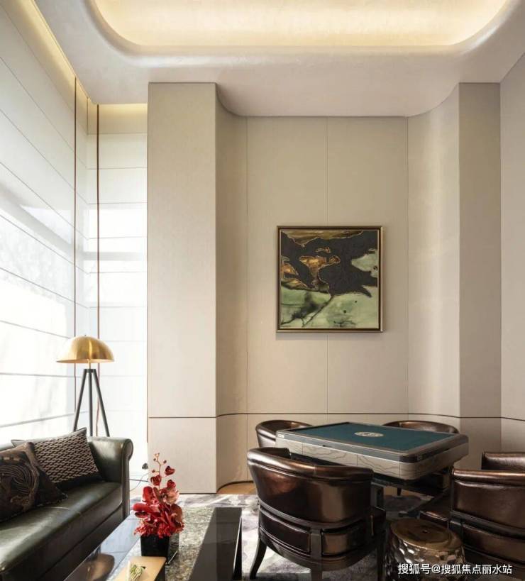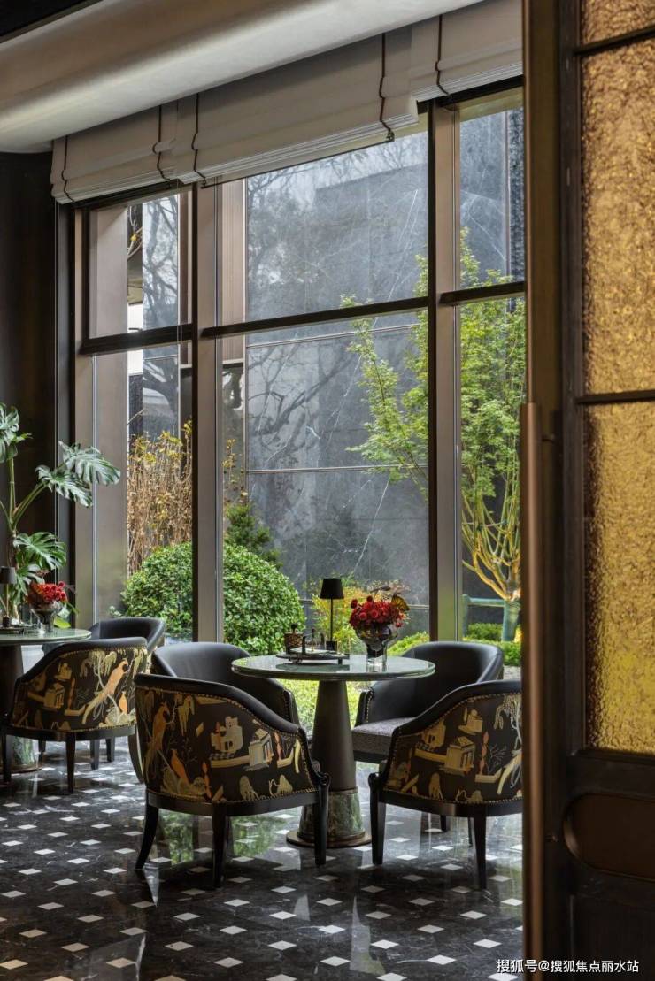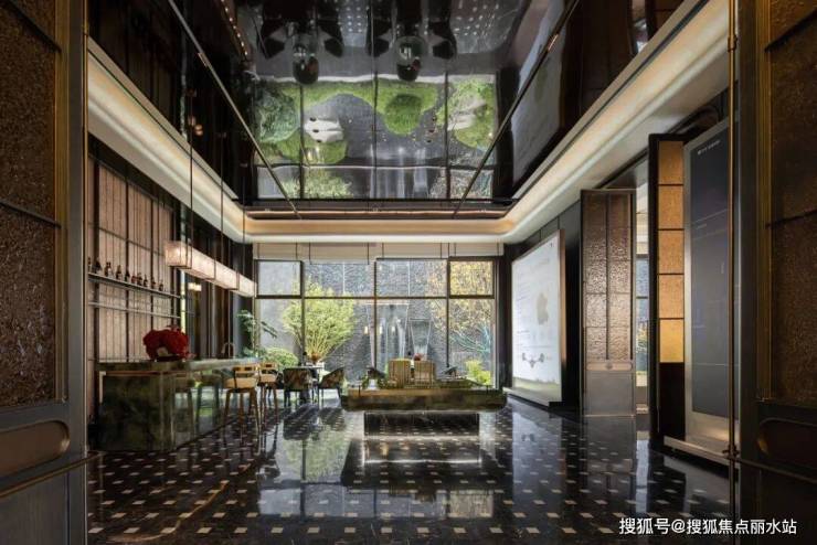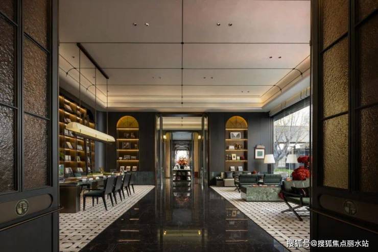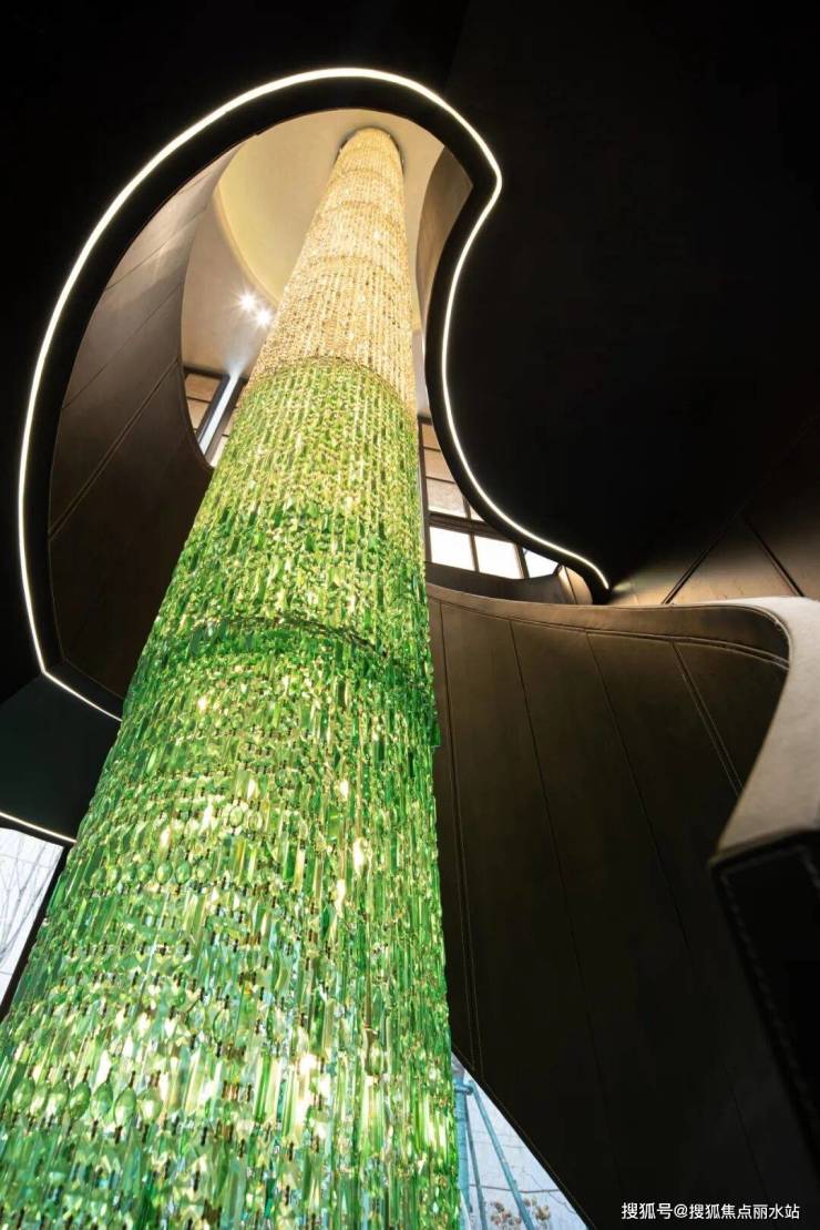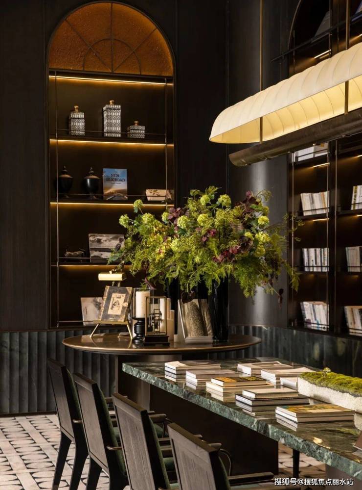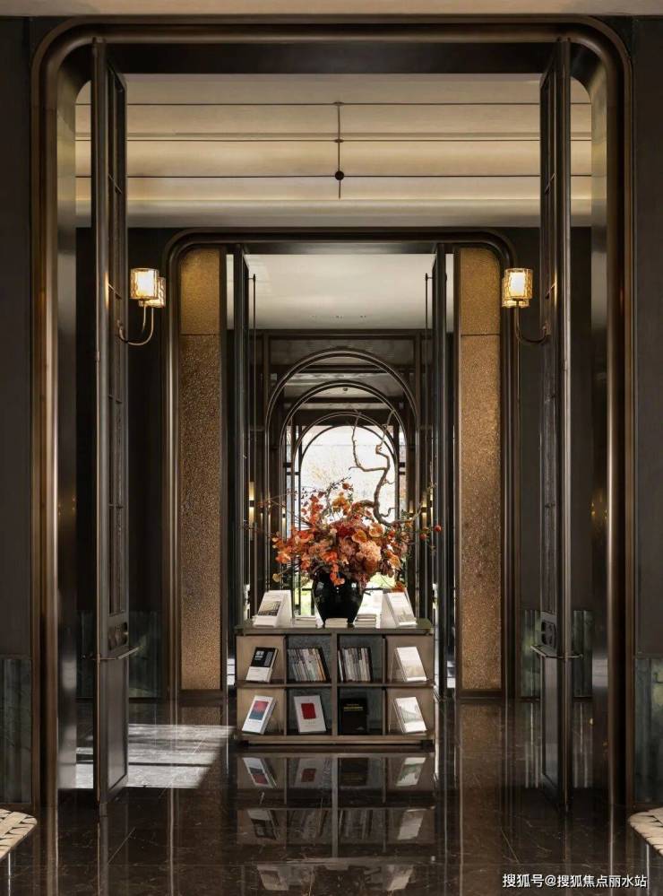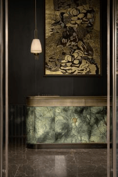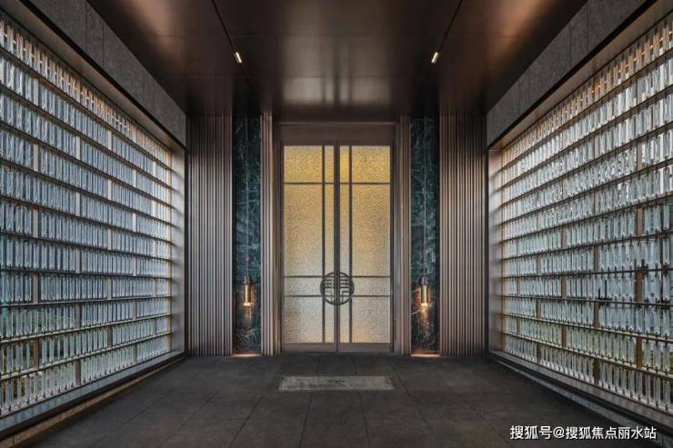 门堂前的过厅,空间方正,天光倾泻,斯卡帕风格的30层跌级在灯光的映衬中向上收束;范思哲黑与普拉达绿奢石交织成的景墙映衬着潺潺水幕,展现出静影沉璧的雅致画卷。