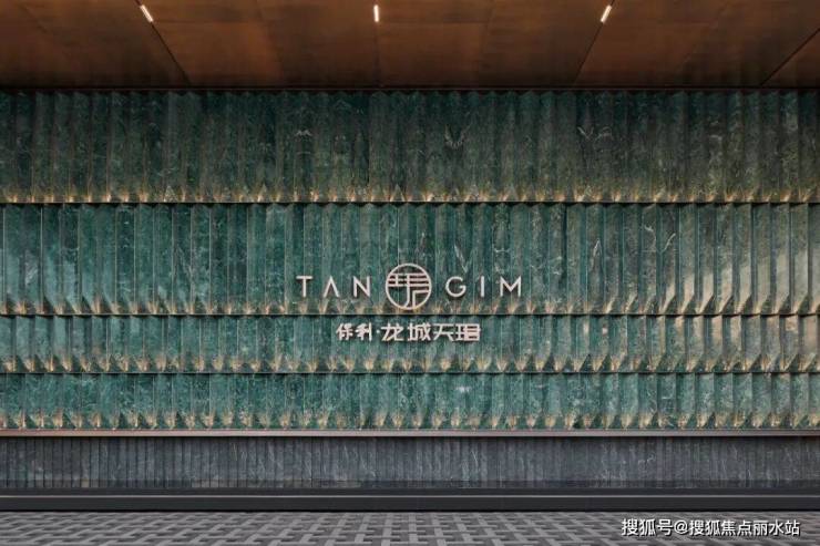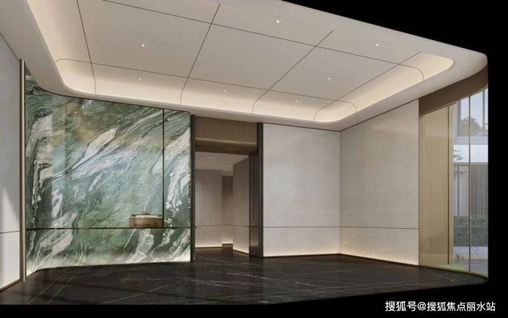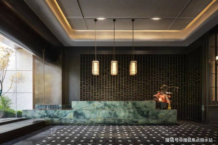 门庭正中为墨尔本绿奢石照壁,此款奢石得名自澳洲,经多轮实地比选后定样。约700块精选的墨尔本绿石材构成了这道宽约18米,高约5.4米的奢石景墙,经过切角与镶嵌的装饰主义划分,在不同角度呈现出波纹流转的变化。