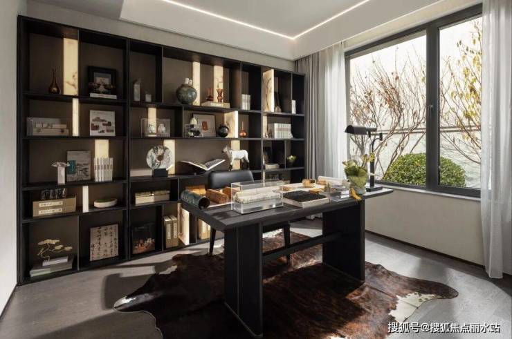 落座于洽谈区,落地窗将户外景致引入室内,悄然抹去室内与自然的边界。琉璃的屏风及满墙的书柜,打破空间的沉闷,增加了空间的情绪及与张力;同时这里也是社区文化交流的场所,未来业主可以在这里参加读书会、讲座等活动,与志同道合的人分享知识和生活。