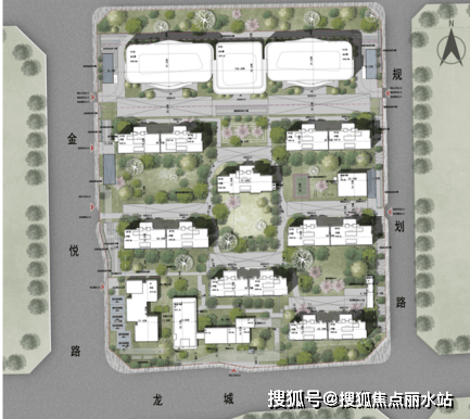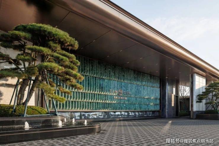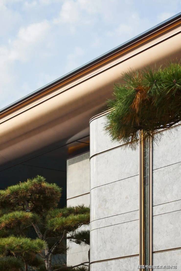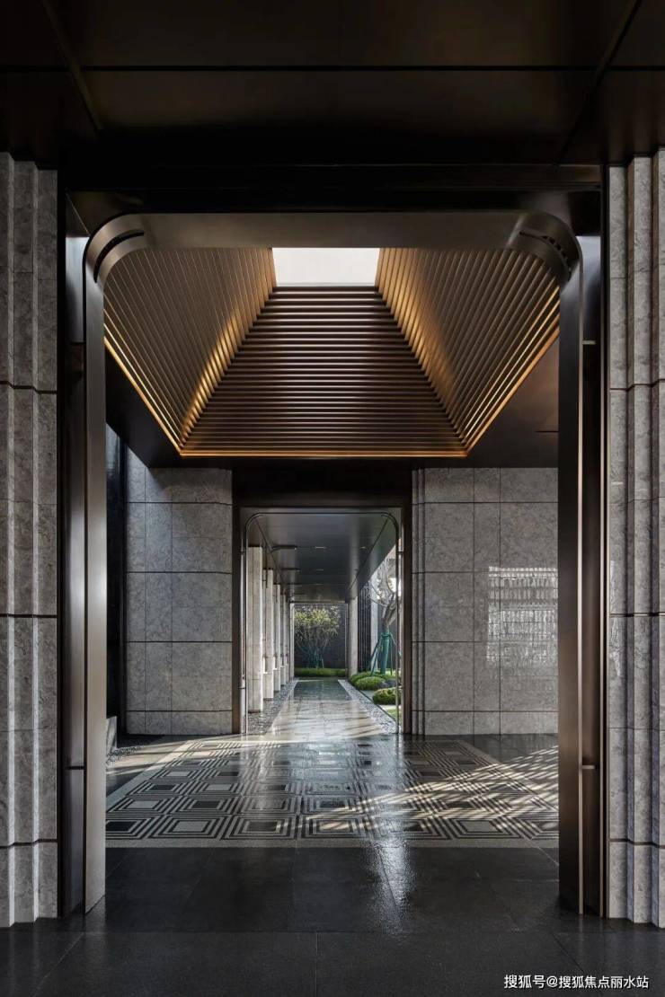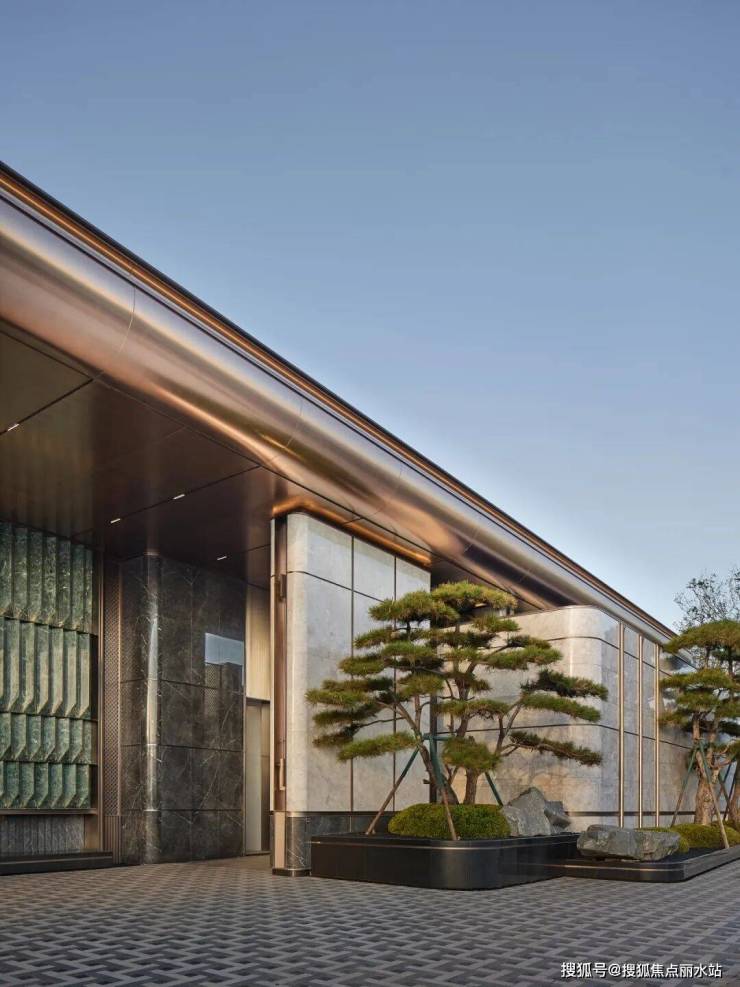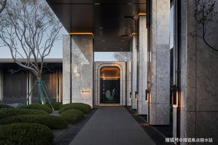 临路设置侧入式的门楼作为人行主入口,采用非对称布局,拉长前场景观动线,营造游园入境、自然隐奢的归家体验;入口门楼高宽比例控制在1:10,强化横向超尺度比例。