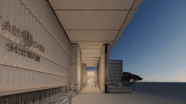 大门右转入园,步入鎏金漫廊,水纹玻璃挂灯身畔随行,尽头的石龛中是以《绽放》为题的雕塑,雕刻纹的穹顶纹理与金属编织的质感立面衬托着温润生动的花瓣之形,与自然盛景相映成趣。