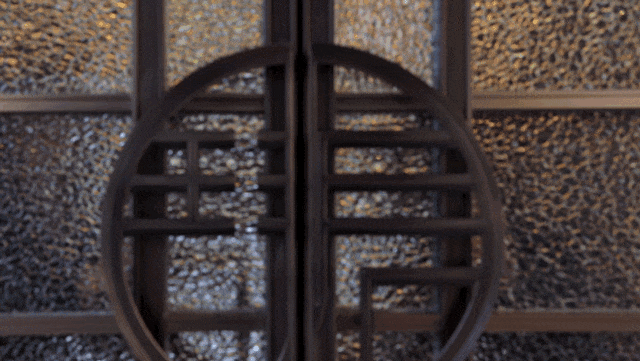 照壁两侧以定制的双层金属浮雕图案映衬,图案纹样以中国传统的方胜纹为设计灵感,寓意美好与吉祥。