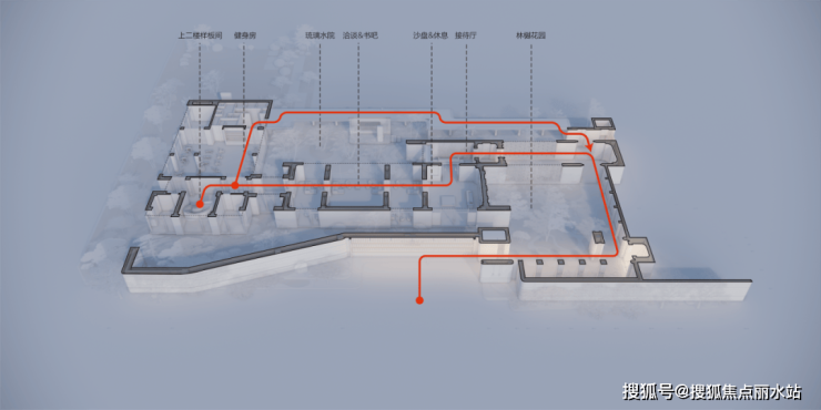 展示区总图采用非对称游廊式布局,横向展开的环绕式动线,强化曲径通幽的空间层次;室内外浑然一体,相互穿插交融,结合主要归家节点设置所见即所得的全景展示区。