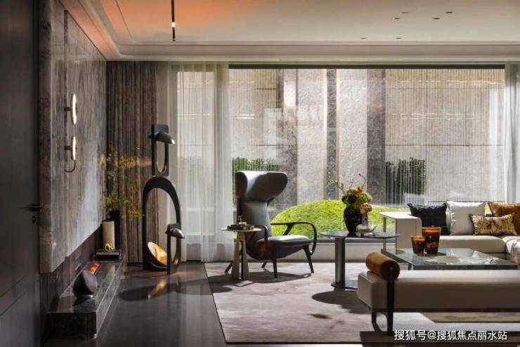 婆娑的树影间,是中国黑自然面石材打造的景墙,一道水瀑随方胜纹衬底导流倾泻,为花园空间带来了生机与活力。