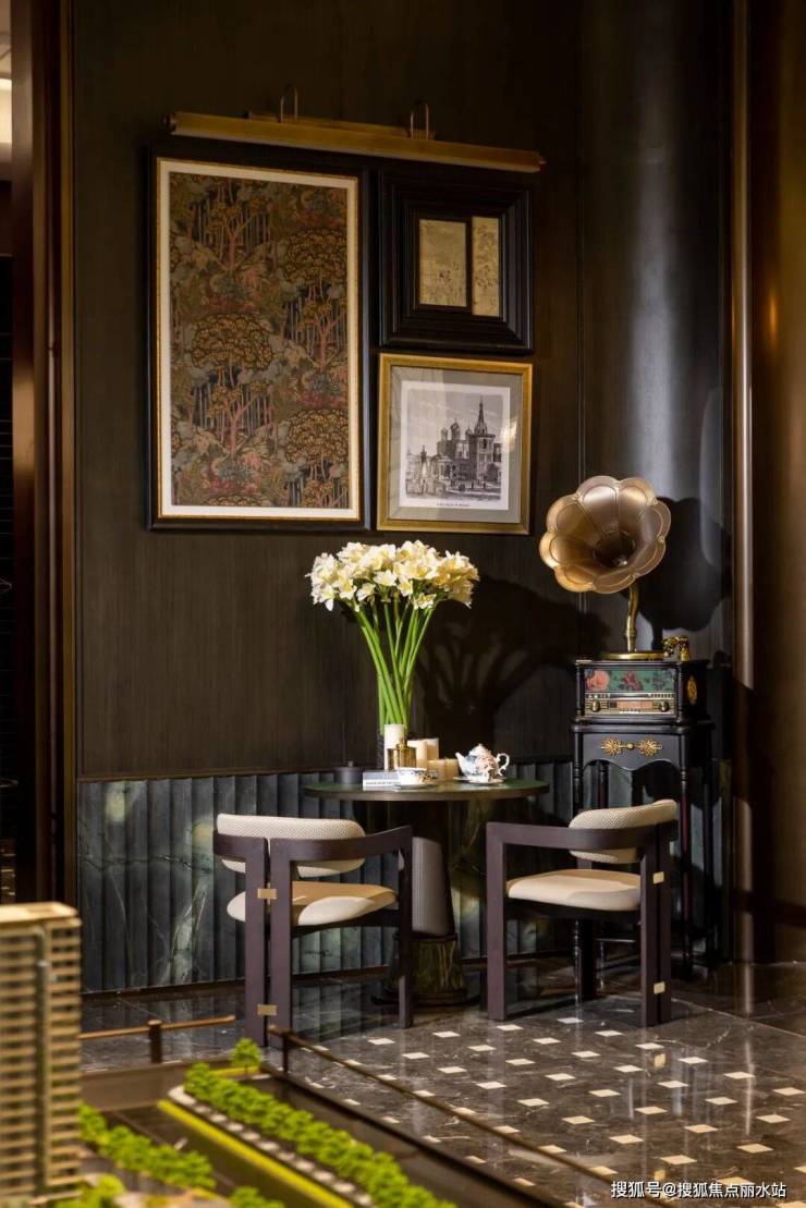 接待大堂设计手法延续海派风格的文化特点,保留了复古与摩登的时尚感,其中提取出晋派建筑标志性合院的回型纹样、瓦片、琉璃、黑金配色和天珺绿奢石五大元素,古典西方与晋派东方的结合,赋予了空间以文化感,实现了中西方文化的交流碰撞。