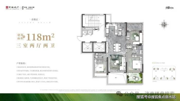 ①约90%得房率;②约9㎡空中花园;③2T2户设计;④独立家政间;⑤客厅/主卧落地窗;⑥方正U型厨房,合理分区;⑦约5㎡设备平台,预留水电位。