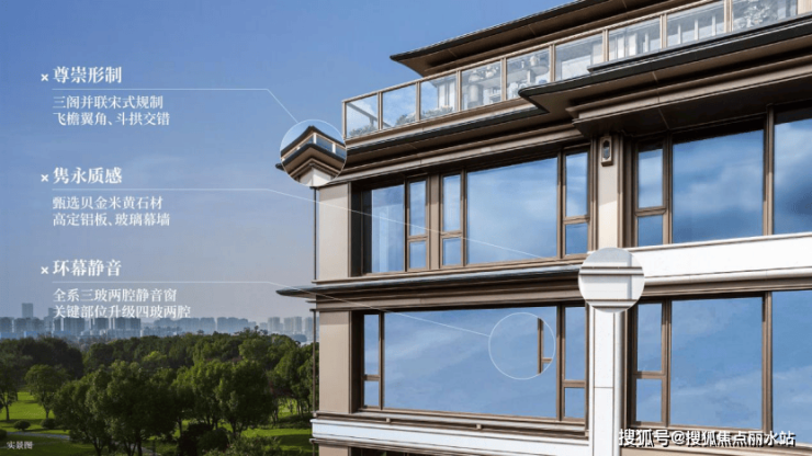 叠墅立面取苏州宋代壁画建筑为原型,运用“三阁并联”宋式尊崇规制,飞檐翼角、斗拱交错,再现江南楼阁门仪。整体甄选贝金米黄石材、高定铝板与玻璃幕墙,全系三玻两腔静音窗,关键部门升级为四玻两腔,为世家呈现宽阔而静谧的奢居之境。