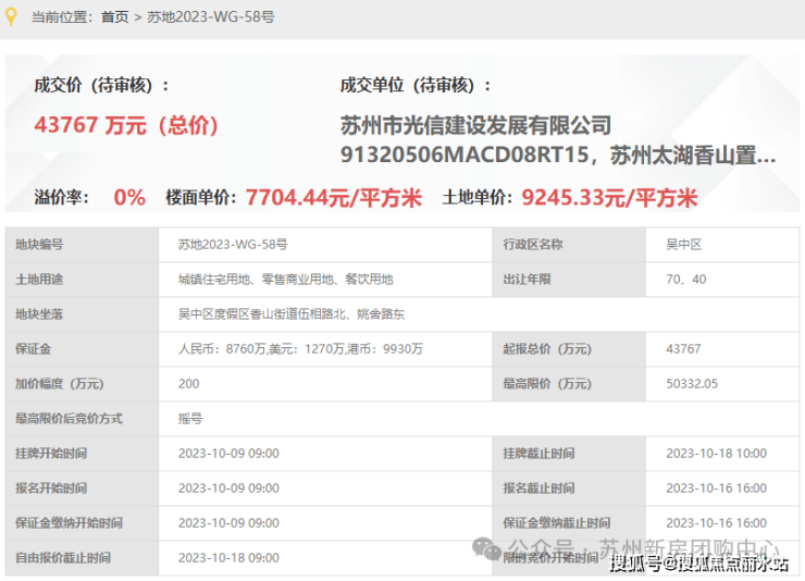 太湖朗墅,即,苏地2023-WG-58号地块,位于吴中区度假区香山街道伍相路北、姚舍路东,是2023年10月18日,光信建设&太湖香山置地以底价43767万元竞得,成交楼面价7704元/平,溢价率0%。