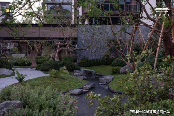 整座下沉式庭院借鉴了四明山“石隐云深”的自然基因,而顺着水轴向南,会是知屿云璟极具造诣的“红线内外一体化设计”所呈现的,约300米绵延的滨河景观带。
