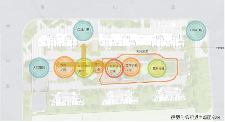 主出入口位于社区西侧,朝向天山北路。这不是一个单纯的入口,你甚至可以把它看成是一个“系统”。