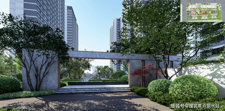 若是从西侧社区归家大堂穿过进入园区,第一眼便看到一面中央开口的景墙。