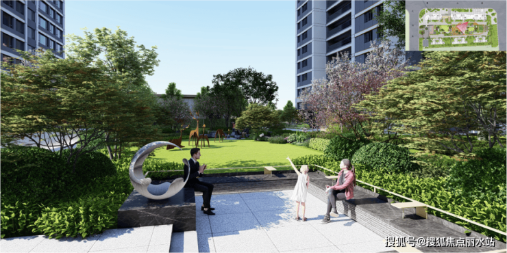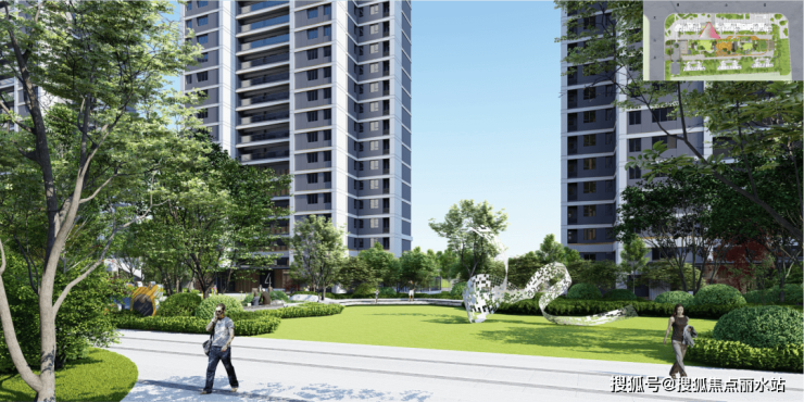 草坪中央耸立着一座艺术雕塑,形如飘逸的缎带,营造出更富艺术气息的居住氛围。