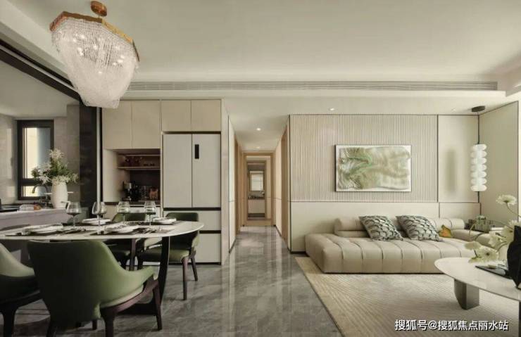 这样,通道就如同“川”字型,一侧是收纳柜,另一侧是厨房、餐桌、沙发等功能区。