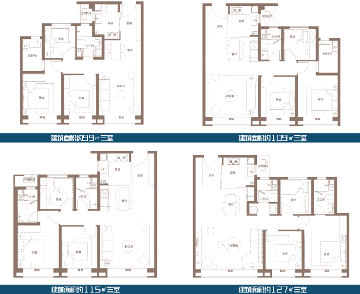 取消了90㎡以下的两居户型, 全部改为三室两卫,建筑面积分别为约99㎡、109㎡、115㎡、127㎡。