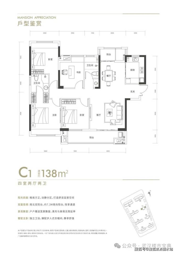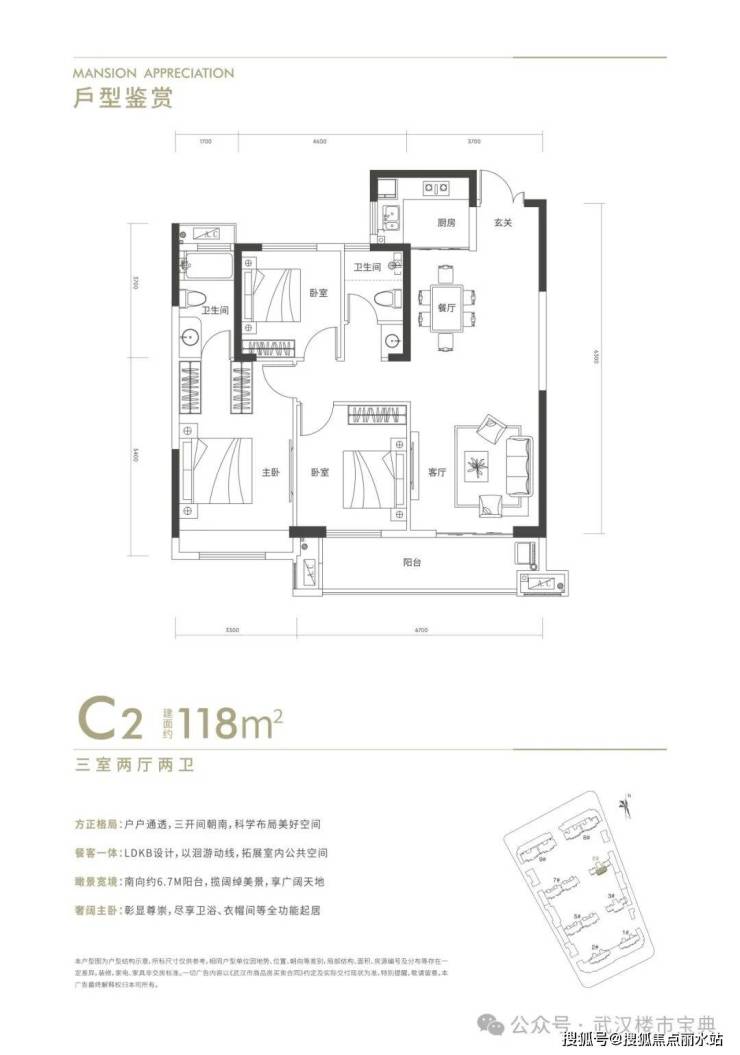 楼栋的中间位置,三开间朝南,北面对连廊,入户赠送一个花园,南向带有较大的双联大阳台,晾晒空间充足;户型动静分区,主卧南北贯通,舒适度不错。