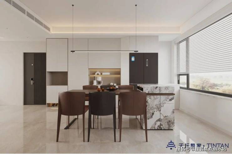 岩板餐桌质感满满,面板岩板材质不易渗透,耐磨耐高温,日常也好打理。餐边柜采用上下储物格+开放格+玻璃展示柜,充分利用好每一寸空间。左侧透明玻璃门加入灯带点缀,用于存放酒和酒杯,增加层次感。
