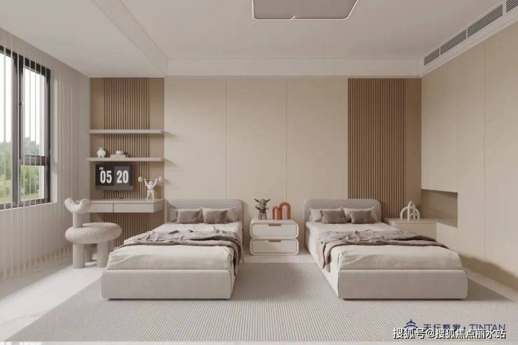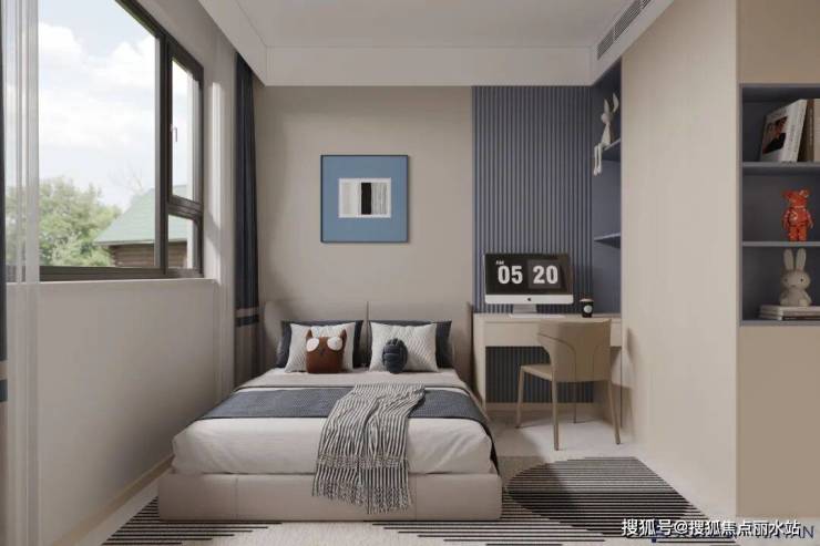 此房间用来做榻榻米,衣柜+储物吊顶+书桌+榻榻米可以高效利用空间,满足收纳与多功能空间的需求,颜值与收纳并存。