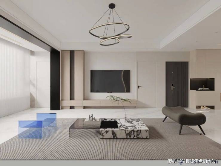 客厅有两个卧室门,都做了外平内开处理,整体更能和谐平整,简洁的电视柜做了展示柜,增加储物的同时更有美感,手办柜出现在电视墙的一侧与石材很好的结合,极大的满足了手办的放置及展示,也能显现业主的爱好与品味。