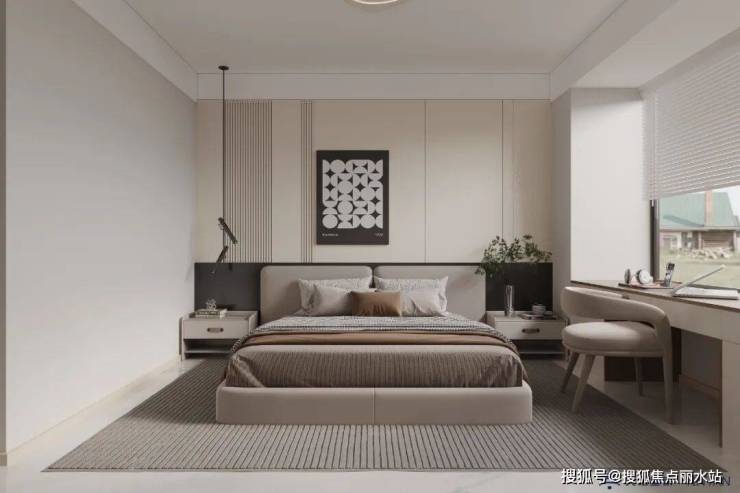 采用暖色系加了黑色的床头背景板,更高级一些,每一天都可以在这里醒来,一定是再幸福不过的事情了。把温柔碾碎放进生活的缝隙里,让温暖浪漫蒸发充满整个家。