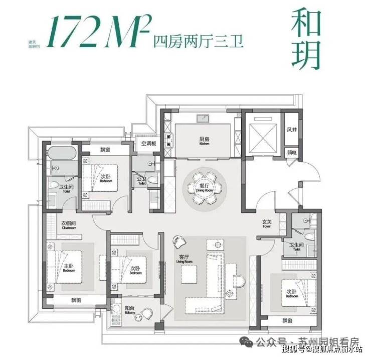 作为建筑新规后的产品,其172㎡户型罕见做到了4房3卫!