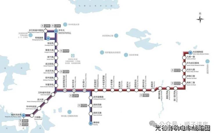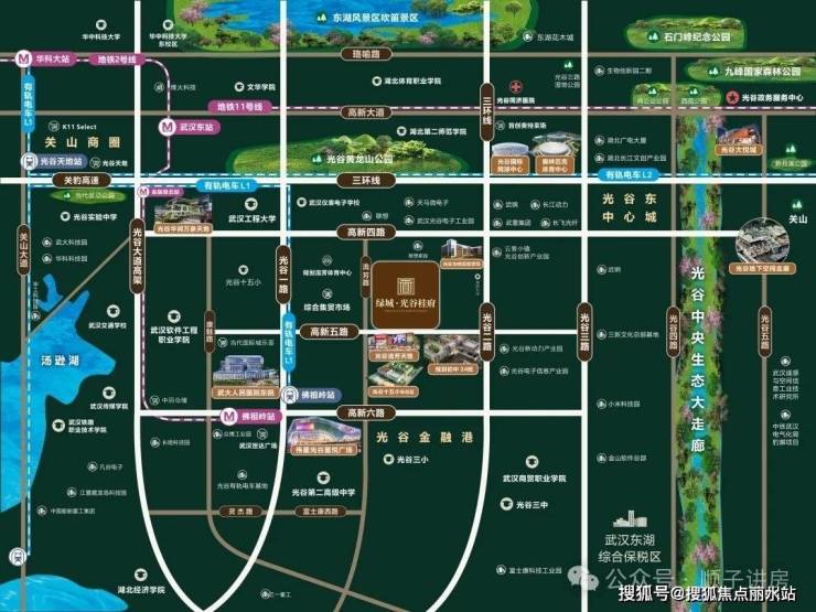 三横三纵,纵向串联光谷金融港、软件园和光谷老城区;横向连接武昌、汉口等核芯地区及光谷东。项目临地铁2号线佛祖岭站和L1有轨电车高新五路站,可通达全城,交通便利
